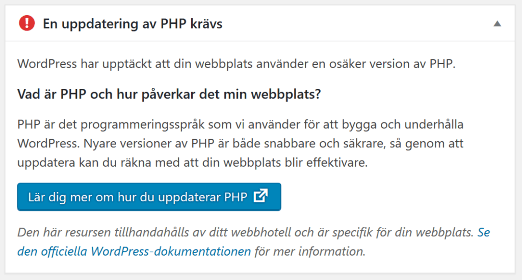 WordPress planerar att höja kravet på PHP-version till version 7.0 senare i år. Vi rekommenderar att du uppdaterar till PHP-version 7.2 eller 7.3. Du kan se vilka versioner av PHP som aktivt utvecklas och vilka som nått ”end of life” (EOL) på php.net under ”Supported versions”.